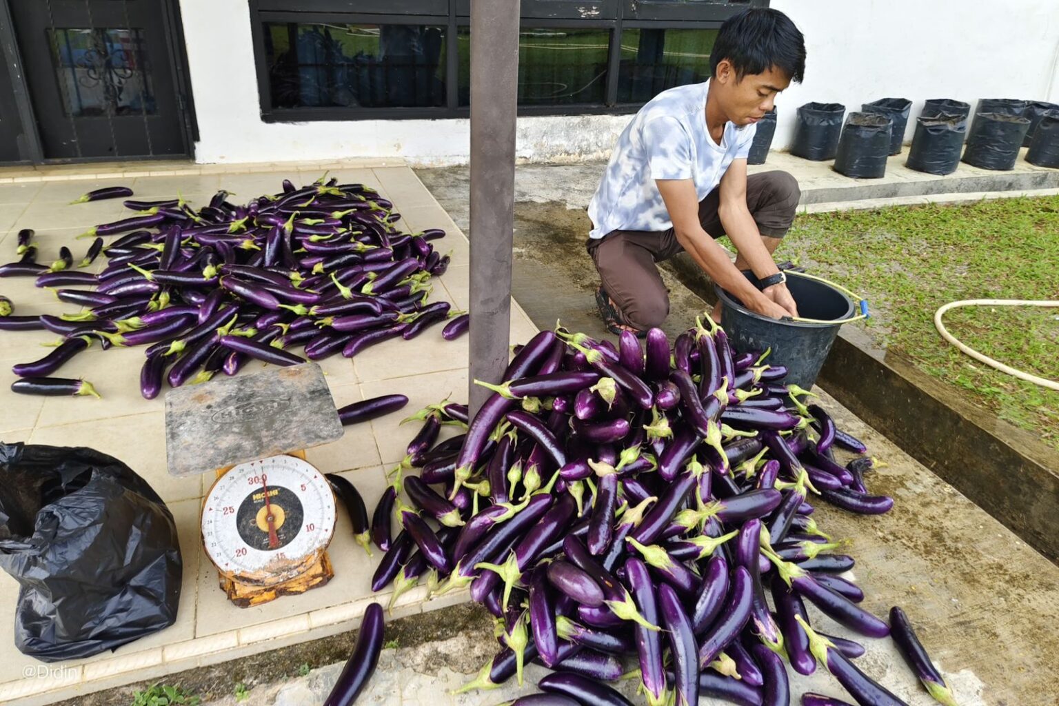 Panen terong ungu yang berhasil dipetik dari lahan pekarangan Gedung Daerah, Lingga. Hasil panen langsung disalurkan ke pasar Dabo untuk memenuhi kebutuhan pangan masyarakat.