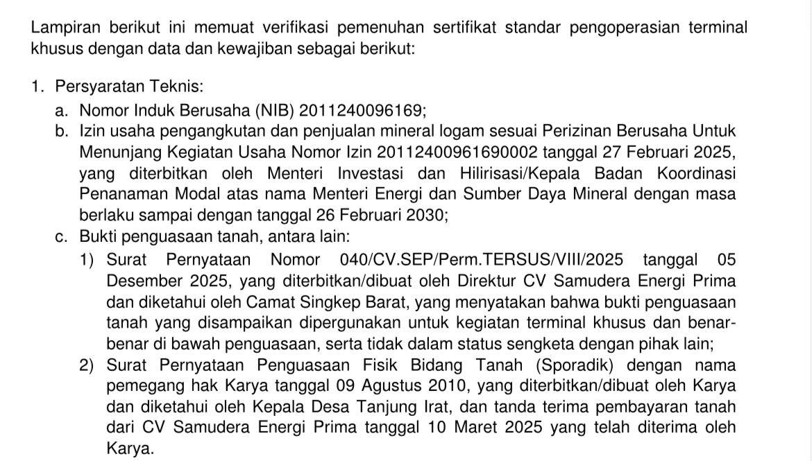 LINGGA TERKINI – Penerbitan izin Terminal Khusus (Tersus) oleh Kementerian Perhubungan pada 30 Desember 2025 di wilayah Desa Tanjung Irat, Kecamatan Singkep Barat, Kabupaten Lingga, menuai tanda tanya dari sebagian masyarakat dan pemerintah desa setempat.