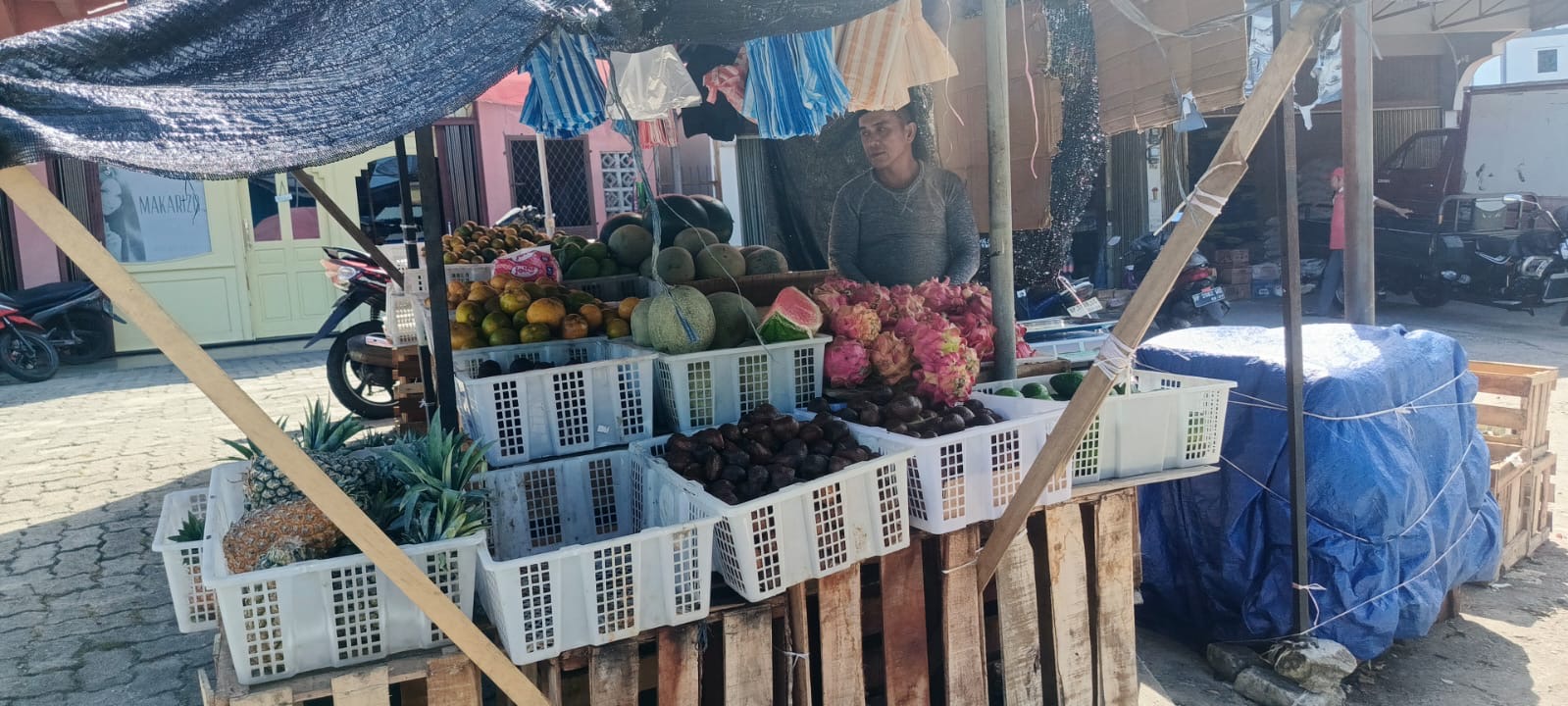 Suasana lapak pedagang buah di Dabo Singkep yang kini lebih ramai setelah dapur MBG mulai beroperasi.