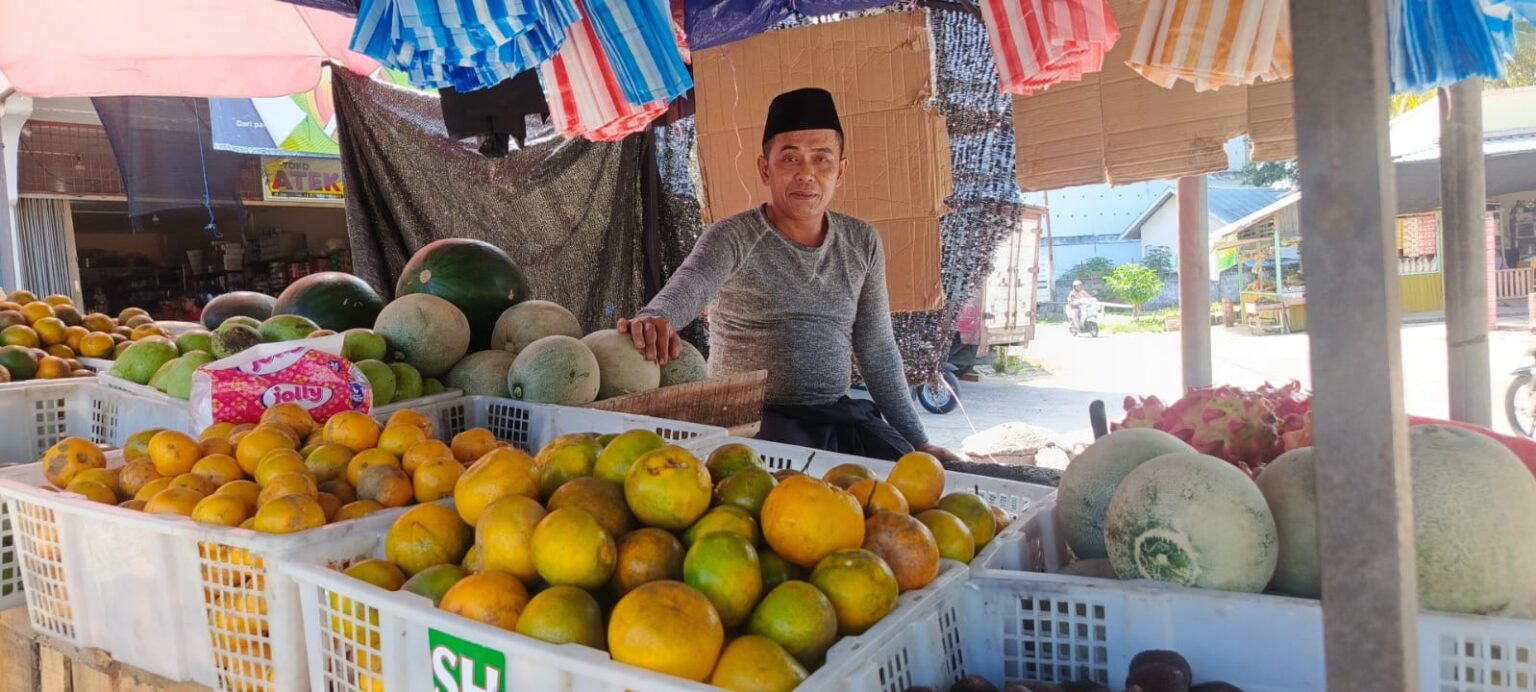 Syahrul, pedagang buah di Dabo Singkep, menunjukkan dagangannya yang mengalami peningkatan penjualan sejak adanya program MBG.